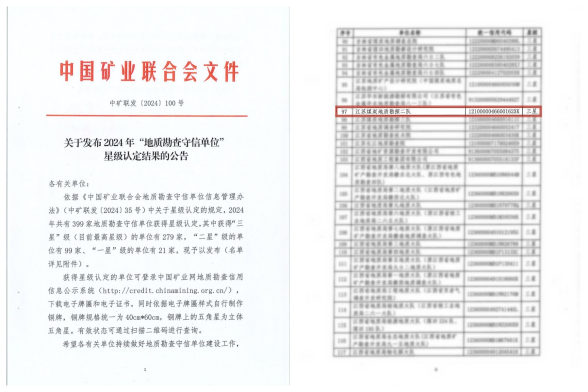 近日,中国矿业联合会发布了2024年“地质勘查守信单位”星级认定结果,二队被认定为“三星”级(目前最高星级),标志着二队在地质勘查专业服务质量和信誉方面得到行业高度认可。